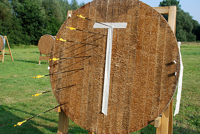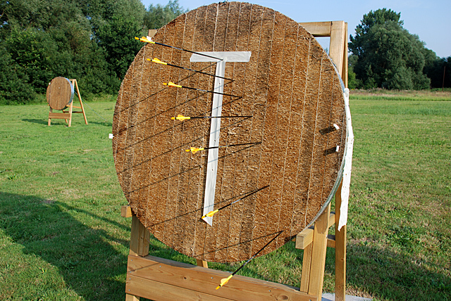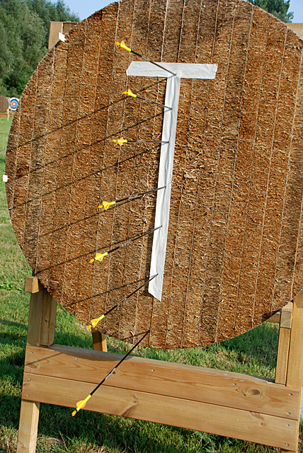 Ob in der Halle oder auf dem Außengelände klebt man auf den Pfeilfang (Zielscheibe) mit einem Krepp- oder Malerband, angefangen im oberen Drittel der Scheibe, eine T-Markierung auf. Das Kreuz der T-Markierung sollte ungefähr 30 bis 35 cm von der Oberkante der Scheibe angebracht sein. Das Kreuz stellt den Zielpunkt (Zielfenster) beim Visieren dar.