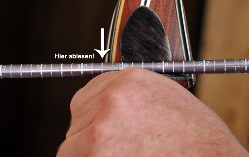 Zur Ermittlung ihrer persönlichen Auszugslänge nehmen Sie einen leichten Bogen, einen Messpfeil und gehen in ihren individuellen vollen Auszug, bis Sie ihren Ankerpunkt gefunden haben. In dieser Position sollten Sie sich vom Gefühl her am wohlsten fühlen. Auf der am Messpfeil aufgebrachten Markierung können Sie (oder besser eine zweite Person) nun ihre Auszugslänge ablesen.