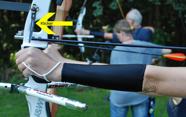 Hat der Bogenschütze seinen Ankerpunkt gefunden, muss er zunächst sicherstellen, dass er mit der Pfeilspitze unter dem Klicker (*) zum Halten kommt (Sichtkontrolle). Die Pfeilspitze sollte sich lediglich 2 bis 3 Millimeter von der Klickerzunge entfernt befinden. Siehe auch obiges Foto.