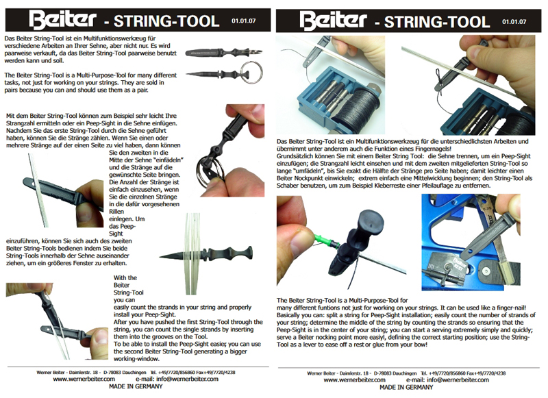 Das Beiter String-Tool ist ein Multifunktions-Werkzeug für verschiedene Arbeiten an der Sehne, aber nicht nur dafür. Dieses kleine, aber sehr nützliche Werkzeug wird paarweise verkauft, da es oft paarweise benutzt werden kann und soll.