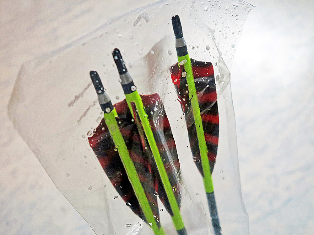 Pfeilschäfte, die nicht optimal abgestimmt sind (und mal ehrlich, die meisten Schützen gehen in dieser Hinsicht oft einen Kompromiss ein oder wissen es einfach nicht besser), fliegen mit trockenen Federn einfach besser. Außerdem stört mich die „nasse-Katzen-Optik“ bei meinen Pfeilen doch sehr stark. Ich versuche daher, meine Naturfedern solange wie möglich vor Regen zu schützen.