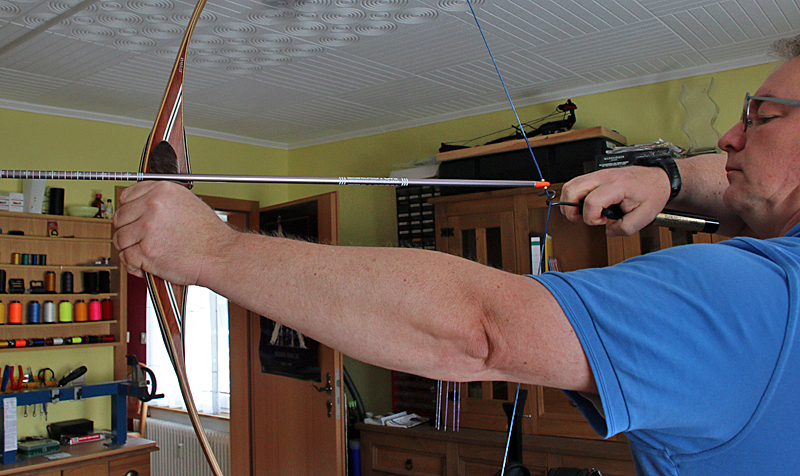 Diese Auszugslänge merkt sich der Partner. Der Schütze hakt jetzt eine Handbogenwaage an die Sehne und zieht jetzt den genau Bogen bis zur vorher gemessenen Auszugslänge aus. Dies kontrolliert wieder der Partner.