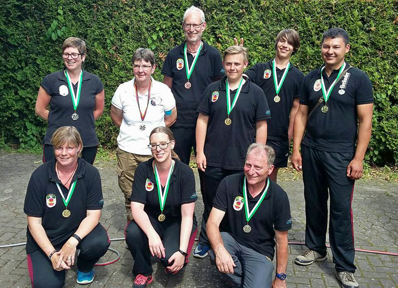 Gestartet bin ich in der Klasse Traditionelle/Blankbogen Damen Altersklasse und ich war die einzige Frau mit einem Langbogen und auch die einzige die nicht mit einem Zielsystem geschossen hat (ich schieße intuitiv). Angetreten bin ich für meinen Heimatverein, den SV Alverdissen. 12 Alverdisser waren dabei – wir stellten bei insgesamt 45 Aktiven die zweitstärkste Gruppe nach dem ausrichtenden Verein. Und wir nahmen sagenhafte 9 Medaillen mit nach Hause.