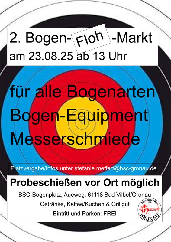 Der Bogen-Floh-Markt wird draußen bei uns auf dem Bogenplatz stattfinden, bitte bringt eure eigenen Tische, Pavillons, etc. mit.