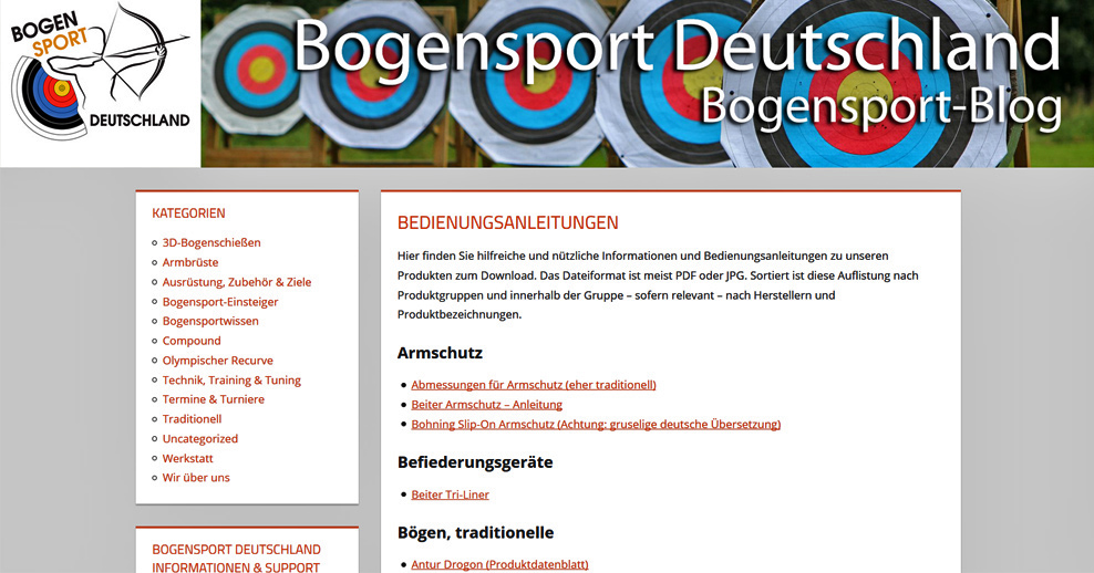 Sie finden dort hilfreiche und nützliche Informationen und Bedienungsanleitungen zu vielen der von uns im Online-Shop von Bogensport Deutschland angebotenen Produkte zum Nachlesen und zum Download.