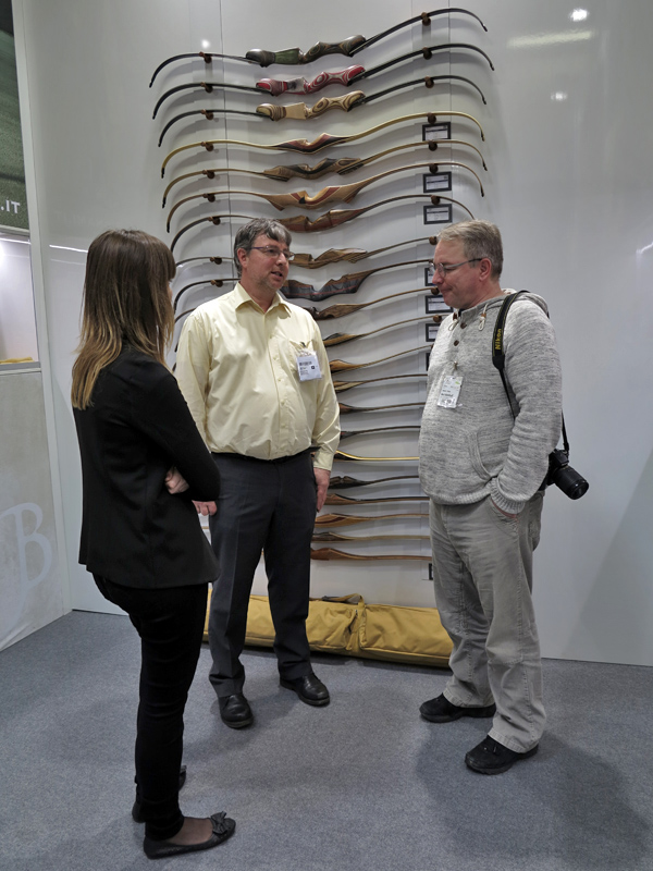 Karin Sprenger und Siegfried Pritzi von Bignami im Gespräch mit Bert Mehlhaff von Bogensport Deutschland (*) (rechts im Bild). Im Hintergrund eine Auswahl traditioneller Bögen, die teilweise neu im Angebot sind.