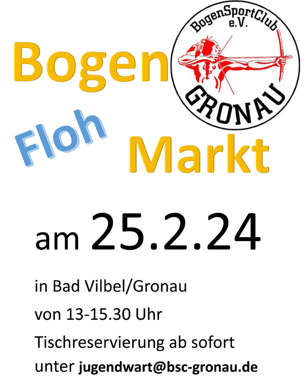 Der Bogensportclub-Gronau e.V. hat sich entschlossen eine eigene Bogenmesse, den Bogen-(Floh-)Markt am 25.02.2024 ab 13.00 Uhr in der Breitwiesenhalle (Aueweg 13, 61118 Bad Vilbel), zu organisieren. Der Aufbau für die Verkäufer ist ab 11.00 Uhr möglich.