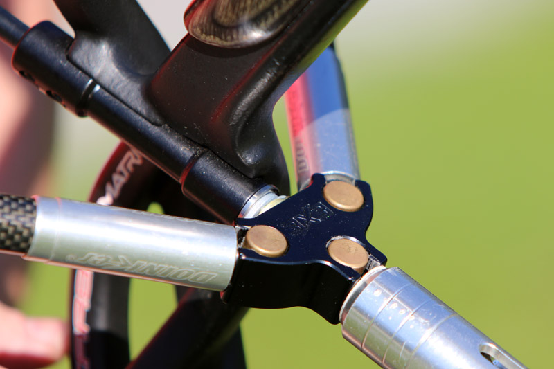 Anbau Spinne / V-Bar (*): V-förmiges Anbauteil, das an der Vorderseite des Bogens angeschraubt wird und zur Aufnahme der Konterstabilisatoren und des Monostabilisators dient.
