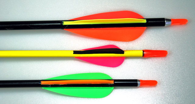 Hahnen-Feder (Cock-feather): Die Feder, die bei waagerecht gehaltenem Bogen und eingenocktem Pfeil nach oben weist. Farblich getrennt von den beiden anderen Federn/Fahnen.