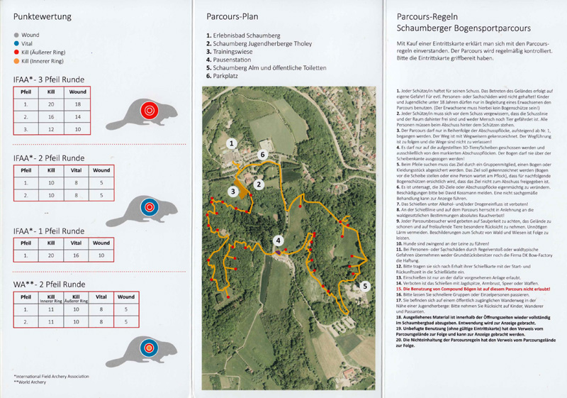 Der Startpunkt des Schaumbergparcours liegt direkt neben der Jugendherberge und in unmittelbarer Nähe des Erlebnisbades Schaumberg. Im Foyer des Erlebnisbades hat David einen kleinen Laden, in dem die Eintrittskarten verkauft werden. Dort können auch Bogenausrüstungen ausgeliehen werden. Jeder Schütze erhält als Eintrittskarte eine Scorecard, die sehr durchdacht ist und informativ gestaltet ist.