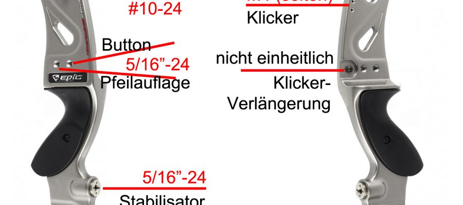 Jedes aktuelle Recurve-Mittelteil aus Metall ist genormt und hat einheitliche Gewindebohrungen für diverses Bogenzubehör. Ich möchte Ihnen