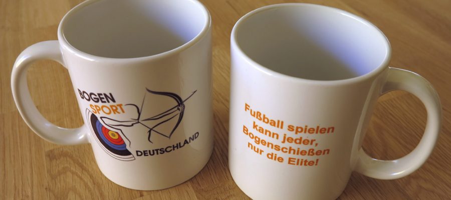 Gerade wieder eingetroffen – unsere Kaffeebecher mit Bogensport Deutschland-Logo und Spruch: Auf der einen Seite tragen die Tassen das Logo von Bogensport Deutschland und auf der anderen Seite den Spruch: „Fußball spielen kann jeder, Bogenschießen nur die Elite!“ Die Becher sind aus weißer Keramik und natürlich spülmaschinengeeignet. Sie sind 9,5 cm hoch und haben einen Durchmesser von 8 cm. Da passt ordentlich Kaffee rein (oder Kakao oder Tee oder Cola oder was auch immer Ihnen schmeckt). Wer zum ersten Mal bei uns vor Ort einkauft, bekommt eine Tasse geschenkt. Unser Laden befindet sich in 32683 Barntrup-Alverdissen, Ostersiek 35. Achtung: damit wir genügend Zeit für Ihre ausführliche Beratung haben, öffnen wir nur nach vorheriger Terminvereinbarung: info@bogensportdeutschland.de oder telefonisch unter 05262 1687.