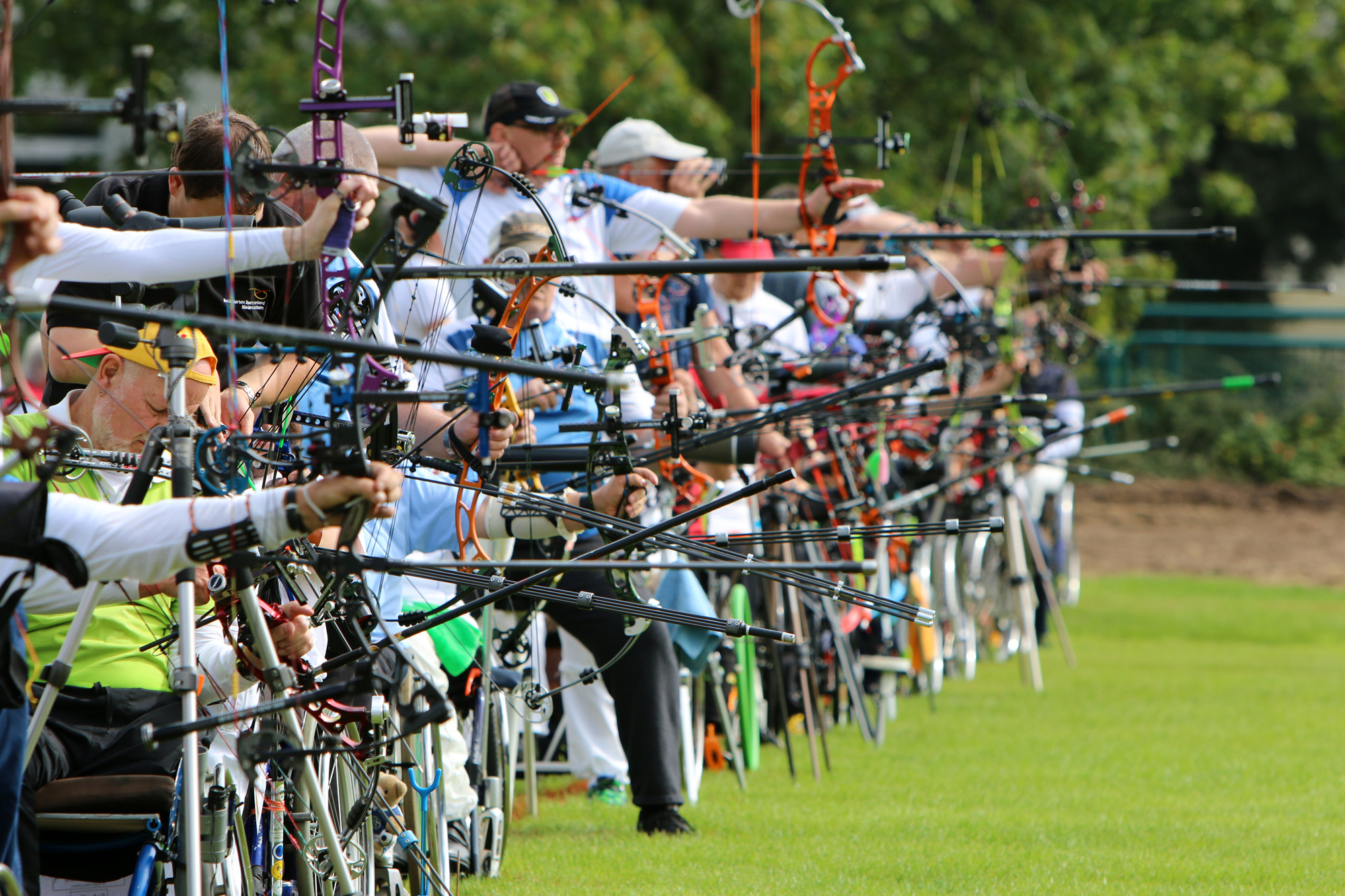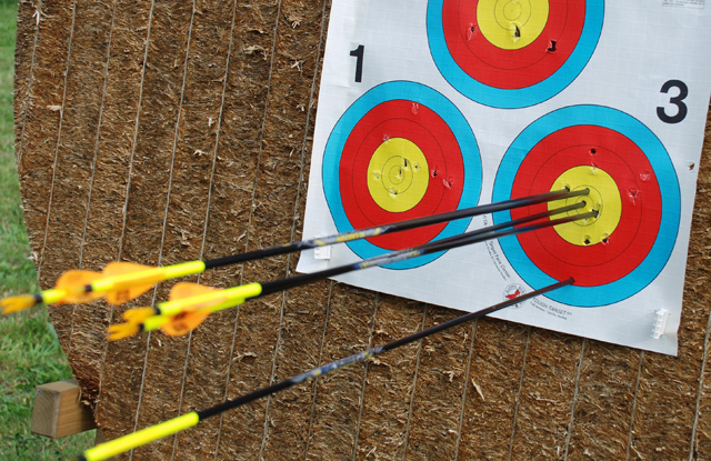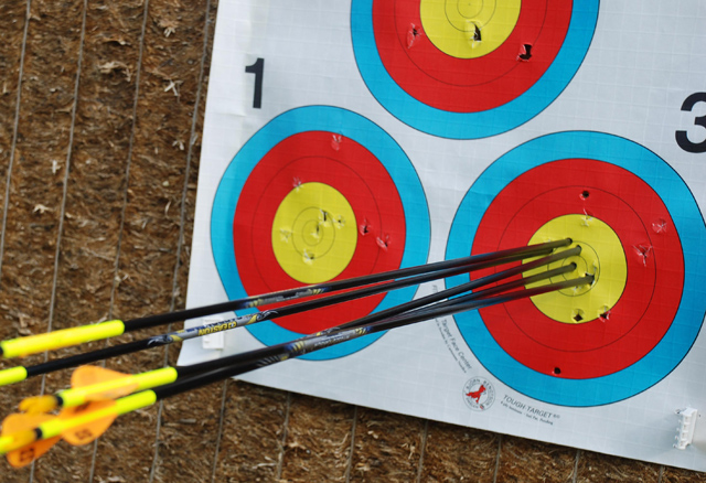 Nachdem nun der Nockpunkt auf der Sehne gesetzt wurde, schießt der Bogenschütze auf eine Entfernung zwischen 15 bis 18 Meter insgesamt 3 befiederte Pfeile auf die Scheibe.
