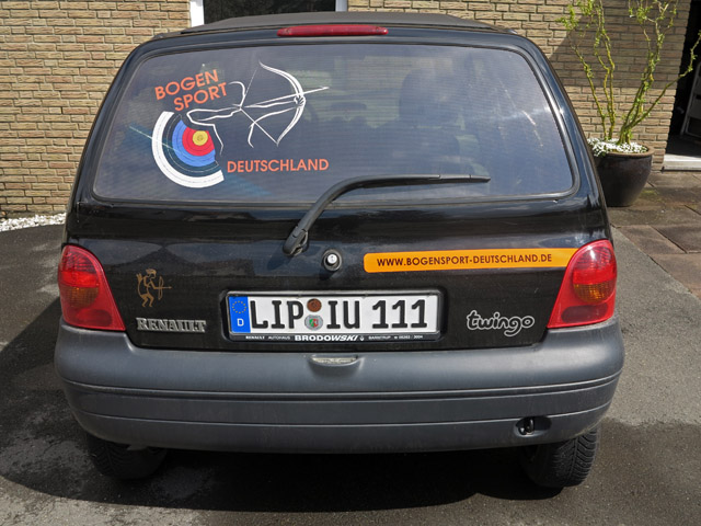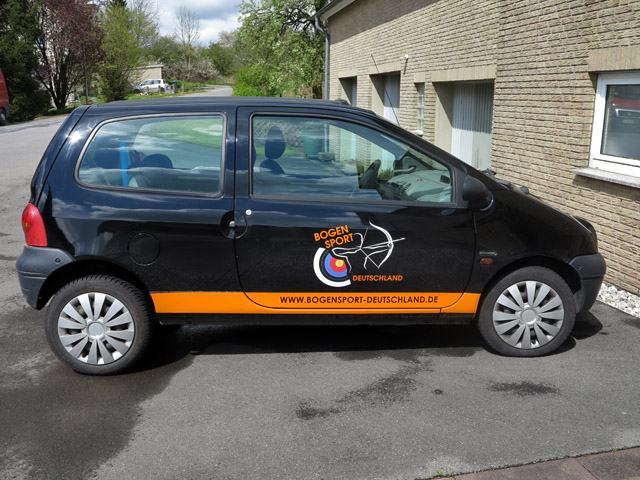 Orange auf schwarz hat mir ja schon immer gefallen. Da wurde es Zeit, meinem treuen Twingo endlich ein neues Outfit zu verpassen. Und dass der Wagen ja seit einem Monat nicht nur zum Deutschen Bogensportverlag, sondern auch zu Bogensport Deutschland (*) gehört, ist jetzt auch nicht mehr zu übersehen: