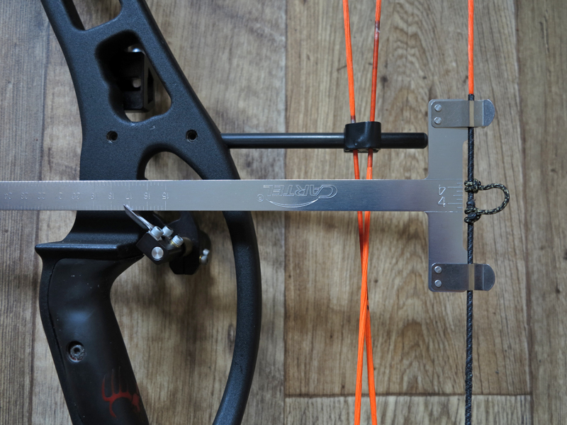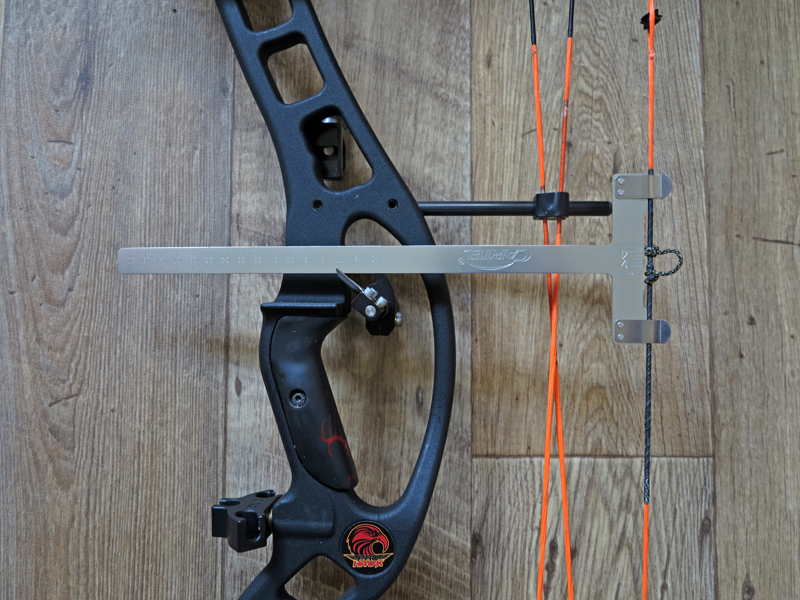 Nehmen Sie einen Checker und setzen diesen mit den beiden Klemmen auf der Sehne auf. Nun korrigieren Sie den Checker in der Höhe so, dass der Messstab die Pfeilauflage (hier: Launcher) berührt. Jetzt haben Sie einen rechten Winkel von 90° zur Sehne. Markieren Sie in Weiterführung dieser Linie einen Punkt auf der Sehne.