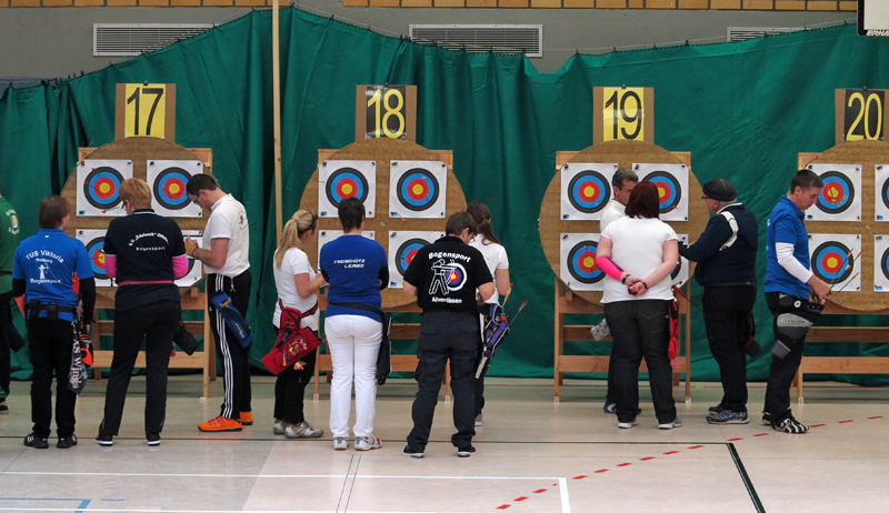 Bei dieser Bezirksmeisterschaft schützen Pfeilfangnetze die Wände der Sporthalle und die Pfeile der Sportler – Foto: © Bert Mehlhaff