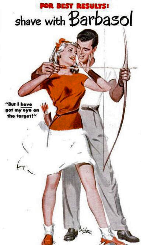 Die Zeitungsanzeige aus dem Jahr 1950 mit dem Titel „For Best Results: shave with Barbasol“ warbt für Rasier-Creme. Erschienen ist dieses Motiv in der Saturday Evening Post. Der Künstler, der dieses Paar beim Bogenschießen zeichnete, war Carl Setter. Schön ist der Kommentar der jungen Frau – sinngemäß: „Aber ich schaue doch auf das Ziel!“.