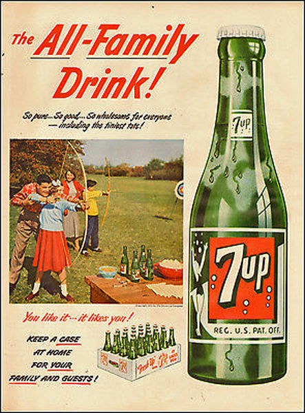 Die auch heute noch beliebte Limonadenmarke 7 Up wirbt hier mit einer Familie beim Bogenschießen für ihr Getränk: