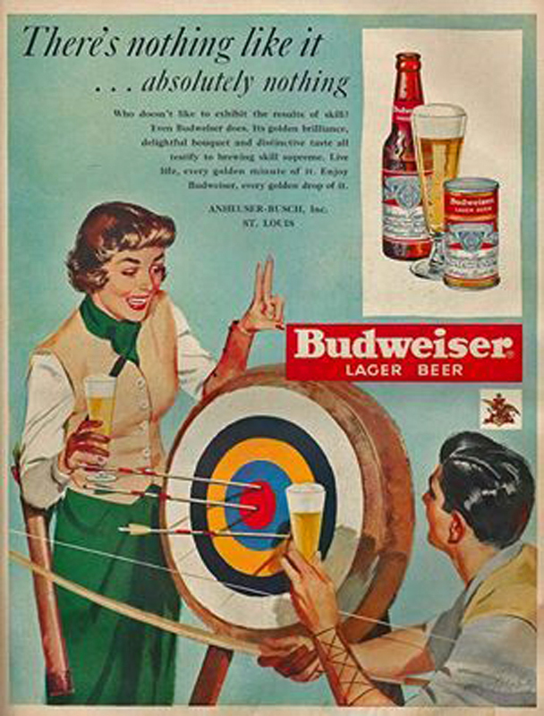 Budweiser warb mit diesem Anzeigenmotiv, das ich Ihnen im Rahmen unserer Reihe „Reklame mit Bogensportmotiven“ heute präsentiere, vermutlich in den 1950er Jahren in diversen amerikanischen Zeitschriften.