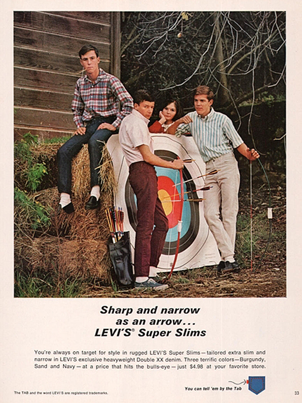 Levi’s warb mit diesem Motiv in den 1970er Jahren. Interessant sind die Anspielungen auf das Bogenschießen im Text: „Scharf und schmal wie ein Pfeil“ und „You’re always on target – Du bist immer im Ziel“.