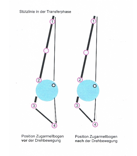 Jetzt folgt der Transfer: Hierbei handelt es sich um eine sehr kleine, aber konsequente Drehbewegung des Zugarmellbogens in Richtung der Stützlinie 1-3