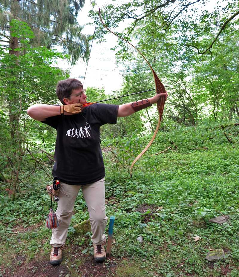 Jetzt fixiere ich mein Ziel und erhöhe weiter meine Rückenspannung. Mit dem Bogenarm drücke ich gleichzeitig den Bogen nach vorn. Beide Seiten – Zug- und Stützseite – müssen ausgeglichen sein. Damit das klappt – eine meiner Schwachstellen – sage ich mir im Stillen immer wieder vor: „Druck nach vorne, Zug nach hinten“.