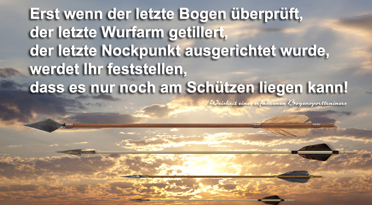 Weisheit eines alten, erfahrenen Bogensporttrainers: „Erst wenn der letzte Bogen überprüft, der letzte Wurfarm getillert, der letzte Nockpunkt ausgerichtet wurde, werdet Ihr