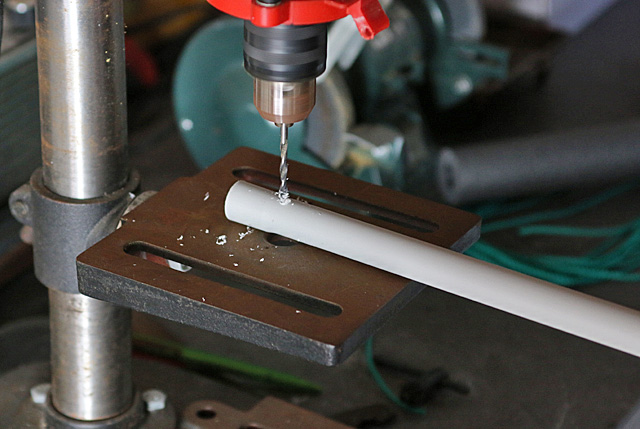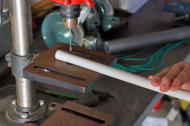 Und los geht’s: zunächst jeweils etwa 2 cm von jedem Ende des Isolierrohres ein Loch bohren. Dabei darauf achten, das beide Löcher auf der gleichen Seite des Rohres liegen.