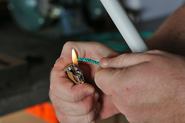 Jetzt wird die Schnur angebracht. Sie sollte ein gutes Stück kürzer sein als das Isolierrohr. Schließlich wollen wir ja einen ordentlich gebogenen Technikbogen haben. Die Schnittkanten unter Zuhilfenahme eines Feuerzeuges verschweissen.