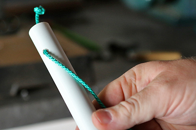 Die Schnur von außen durch das gebohrte Loch schieben und am Ende verknoten. Am anderen Ende natürlich genauso.