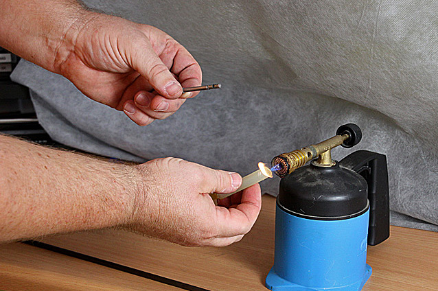 Halten Sie das Insert oder die Spitze mit einer Zange über eine kleine Flamme. Hierzu eignen sich am besten handelsübliche Bunsenbrenner oder Alkoholbrenner. Für unterwegs (paßt in jede Bogentasche) gibt es Sturmfeuerzeuge mit extra heißer Flamme.