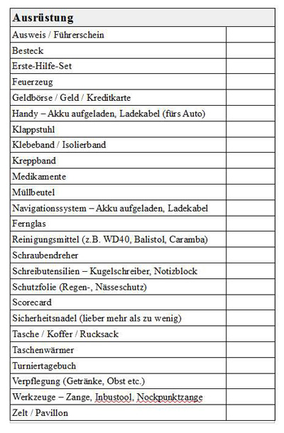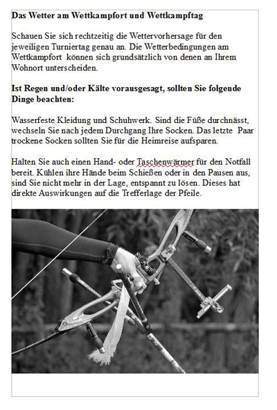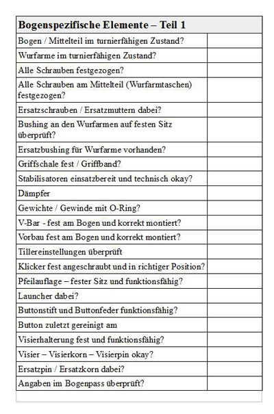 Unsere Turnier-Ratgeber für Bogenschützen mit seinen Checklisten begleiten Sie durch ein Dutzend Turniere und sorgen dafür, dass Ihr Turniererfolg nicht durch vermeidbare technische Defekte oder mangelhafte Organisation auf der Strecke bleibt.