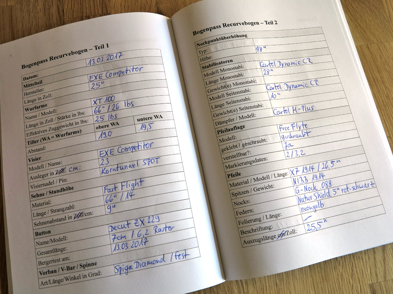 Hier beispielhaft einige Seiten aus meinem persönlichen Bogenpass für meinen Recurvebogen: