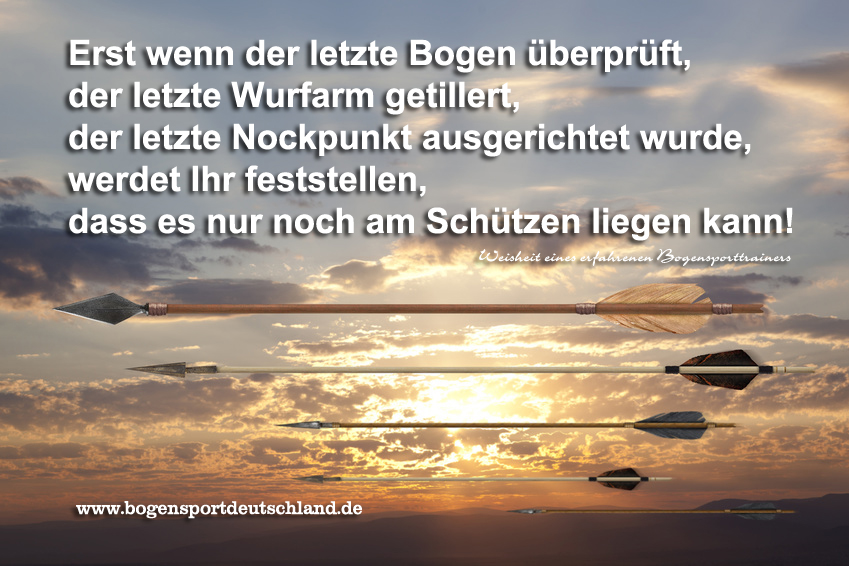 Der Gerät muss (und da geht kein Weg dran vorbei !) natürlich im System (Schütze, Bogen, Pfeil) abgestimmt sein, das ist gesundheits- und sicherheitsrelevant !!. Aus eigener Erfahrung funktioniert das nur mit Hilfe von Experten/Trainern. Anlesen+ausprobieren wird teuer…und gefährlich.