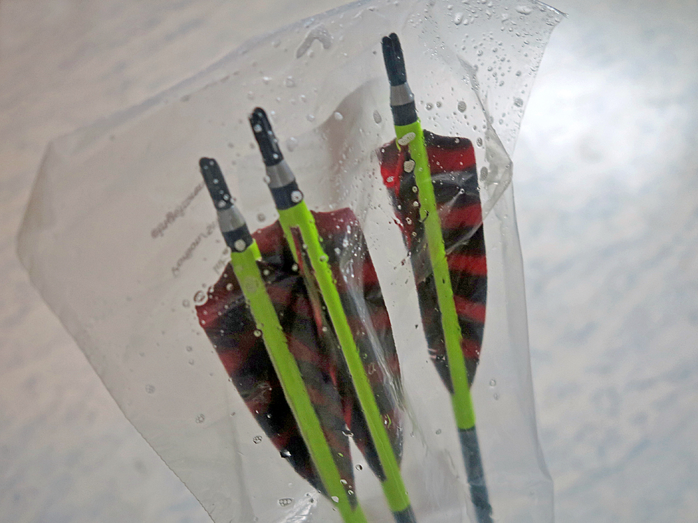 - Federn und Fahnen vor Nässe/Regen schützen. Nehmen sie eine kleine Plastiktüte und stülpen diese über das Ende der Pfeile.