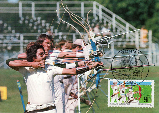 Diese Maximumkarte mit Briefmarke und Sonderstempel erschien zur Erstausgabe am 15.4.1982. Die Zuschlagsmarke (90 + 45, damals noch Pfennige) zeigt zwei stehende und einen Bogenschützen im Rollstuhl. Bemerkenswert an der Darstellung auf der Marke (unten rechts) finde ich, dass alle drei Schützen ein Fernglas vor der Brust baumeln haben. War das damals üblich?